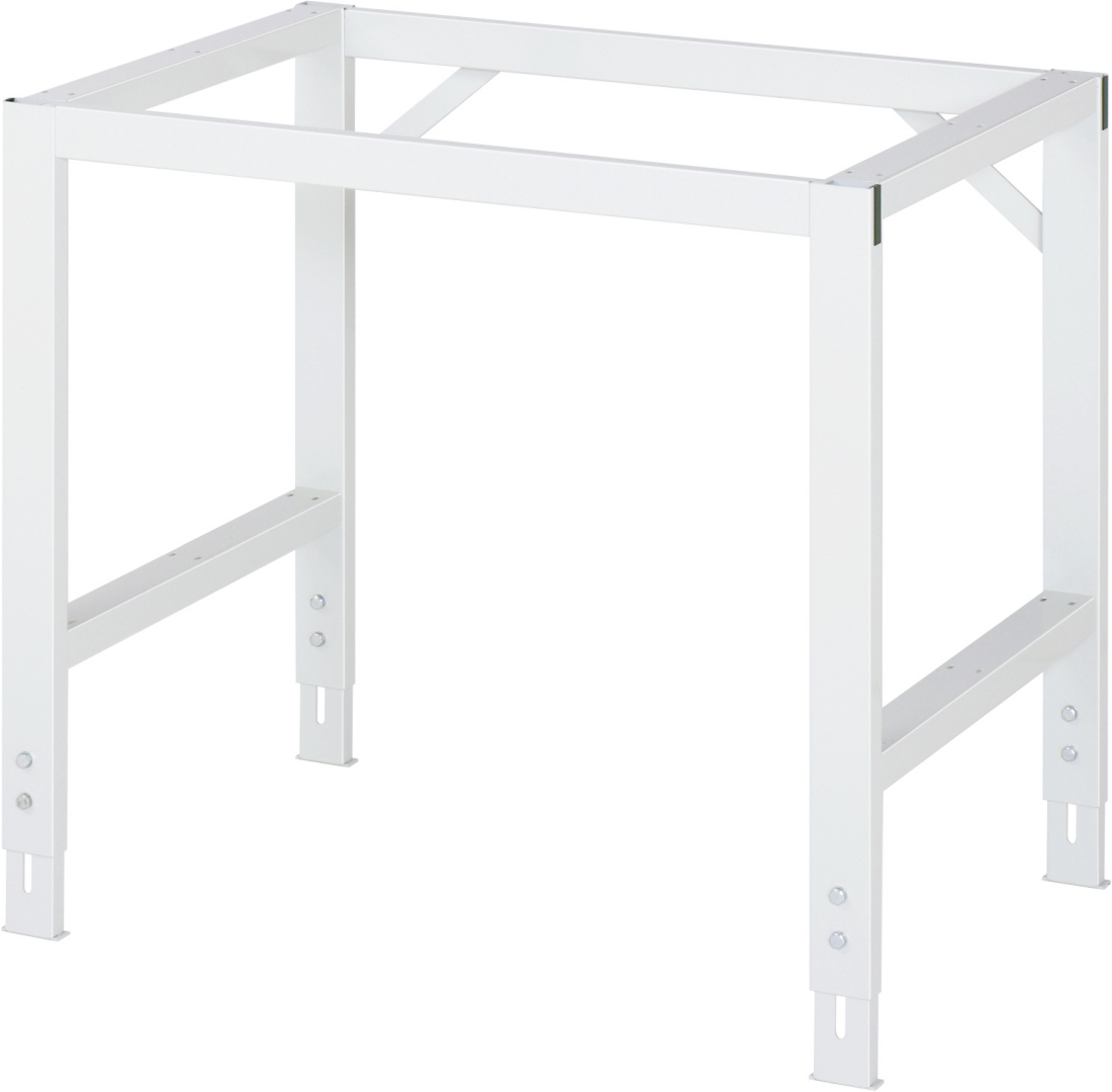 - 4-Fuß Gestell mit zwei Gestellfußpaaren aus Profil-Stahlrohr (60x30x2 mm) inkl. Tiefenverstrebungen (oben und unten). Gestellfüße unten mit Abschlusselement inkl. Höheneinstellung. Querstreben aus Profil-Stahlrohr (50x25x2 mm) oben unter der Arbeitsplatte (vorne und hinten). Aussteifungstraversen hinten (links und rechts) als Verbindung zwischen Gestellfußpaar und hinterer Querstrebe. Die Gestellfüße sind vorbereitet für die Aufnahme/Nachrüstung eines Rollensatzes.