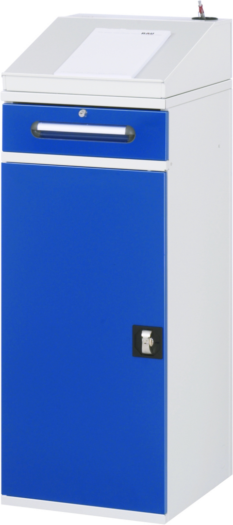- Kleinfach (Höhe 120 mm) mit Schublade (abschließbar). Schublade B370 x T400 x H120 mm (Auszug 100 %, Tragkraft 35 kg, abschließbar), inkl. Beschriftungsstreifen.