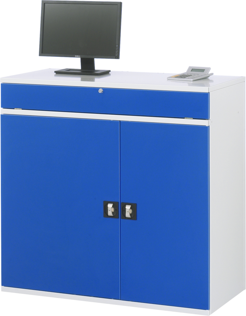 - Tastaturfach(Höhe 120 mm) mit Frontklappe (abschließbar) und Tastaturauszug. Tastaturauszug B1020 x T450 mm zur Tastatur- und Mausauflage (Auszug 80 %, Tragkraft 20 kg, Rastpunkt).