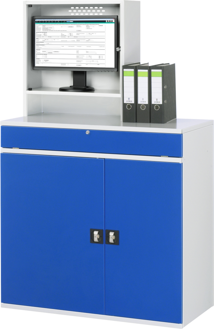 - Monitorgehäuse (B650 x T250 x H710 mm) mit abschließbarem Monitorfach (innen B635 x T230 x H530 mm, integriertes Belüftungsraster) für Bildschirme bis max. 26“ geeignet. Unter dem Monitorfach ist ein offenes Ablagefach (Fachhöhe 140 mm).