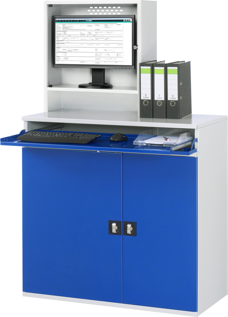 - Tastaturfach(Höhe 120 mm) mit Frontklappe (abschließbar) und Tastaturauszug. Tastaturauszug B1020 x T450 mm zur Tastatur- und Mausauflage (Auszug 80 %, Tragkraft 20 kg, Rastpunkt).