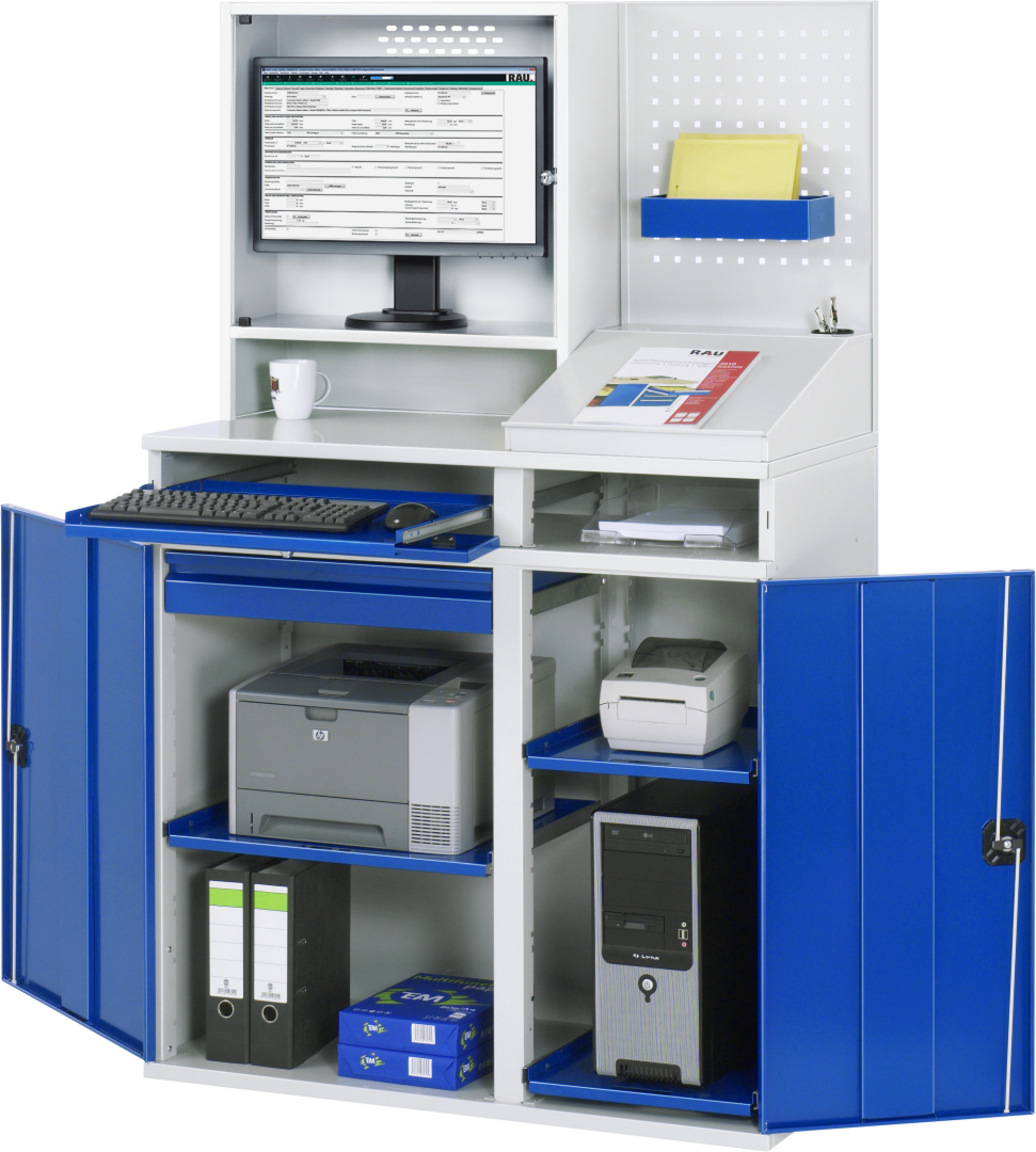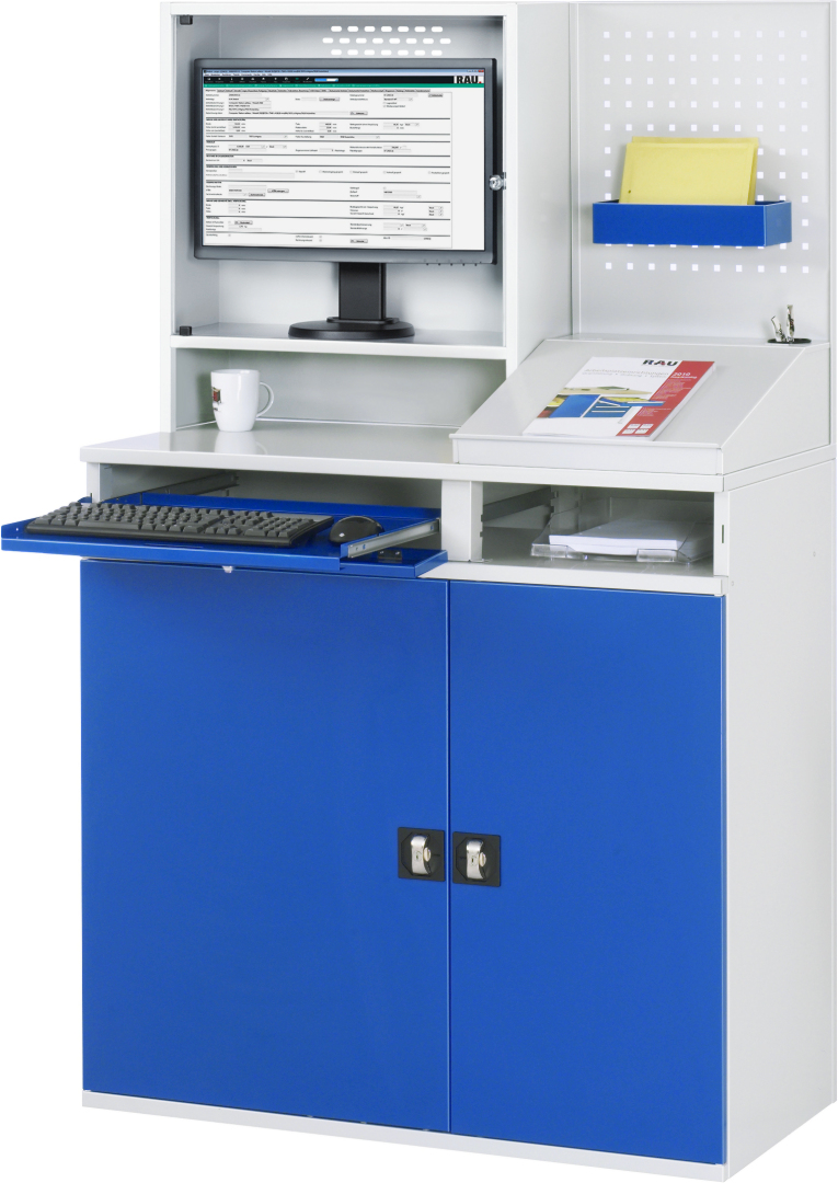 - Lochplattenrückwand neben dem Monitorgehäuse mit 4-Kant Systemlochung (Lochung 10x10 mm, Abstand Lochmitte-Lochmitte 38 mm) zur Aufnahme von Lochplatten-Zubehör, davor Schreibaufsatz mit Klappdeckel (vorne mit Anschlagleiste) und Stiftbecher. Auflagenhöhe 400 mm.
