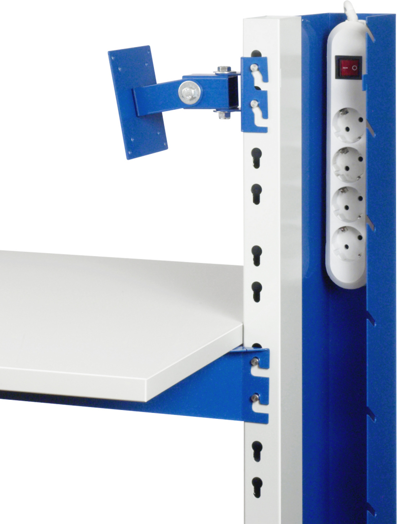 - Zentralsäule unten mit Stahlrohrgestell inkl. Niveauausgleichsfüßen und Ablage (melaminharzbeschichtet). Säule mit Systemlochraster zur Aufnahme von Flachbildschirmhalter, Ablagen, Schubladen, sowie integriertem Kabelkanal mit Klappdeckel, inkl. Energieleiste mit 4 Steckern, Anschlusskabel und Stecker (Norm-Deutschland). Klappdeckel beidseitig mit Schlitzraster für Kabelzugang.