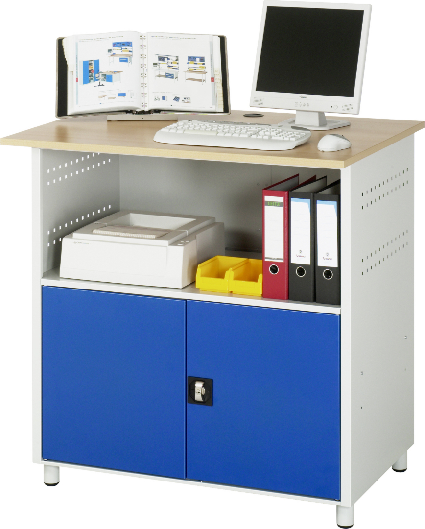 - Basisschrank (B1100xT630xH1035 mm) oben mit offenem Ablagefach (Höhe 415 mm) und unten mit Flügeltürfach (Höhe 550 mm mit Doppel-Flügeltür, Öffnungsweite ca. 100°, abschließbar). Seitenwände links und rechts mit einem Doppel-Lochraster mit 4-Kant Systemlochung (Lochung 10x10 mm, Abstand Lochmitte-Lochmitte 38 mm) zur Aufnahme von Lochplatten-Zubehör (innen und außen nutzbar). Kabeleinlass an der Schrankrückseite sowie Kabeldurchlässe im Innenteil. Rollensatz mit 4 Lenkrollen, davon 2 mit Feststeller (Rollendurchmesser 100 mm, Bauhöhe 125 mm, Laufbelag aus thermoplastischem Gummi (grau, spurlos, 85° Shore), Radkörper aus Polypropylen). Befestigung mit Gewindeplatten.