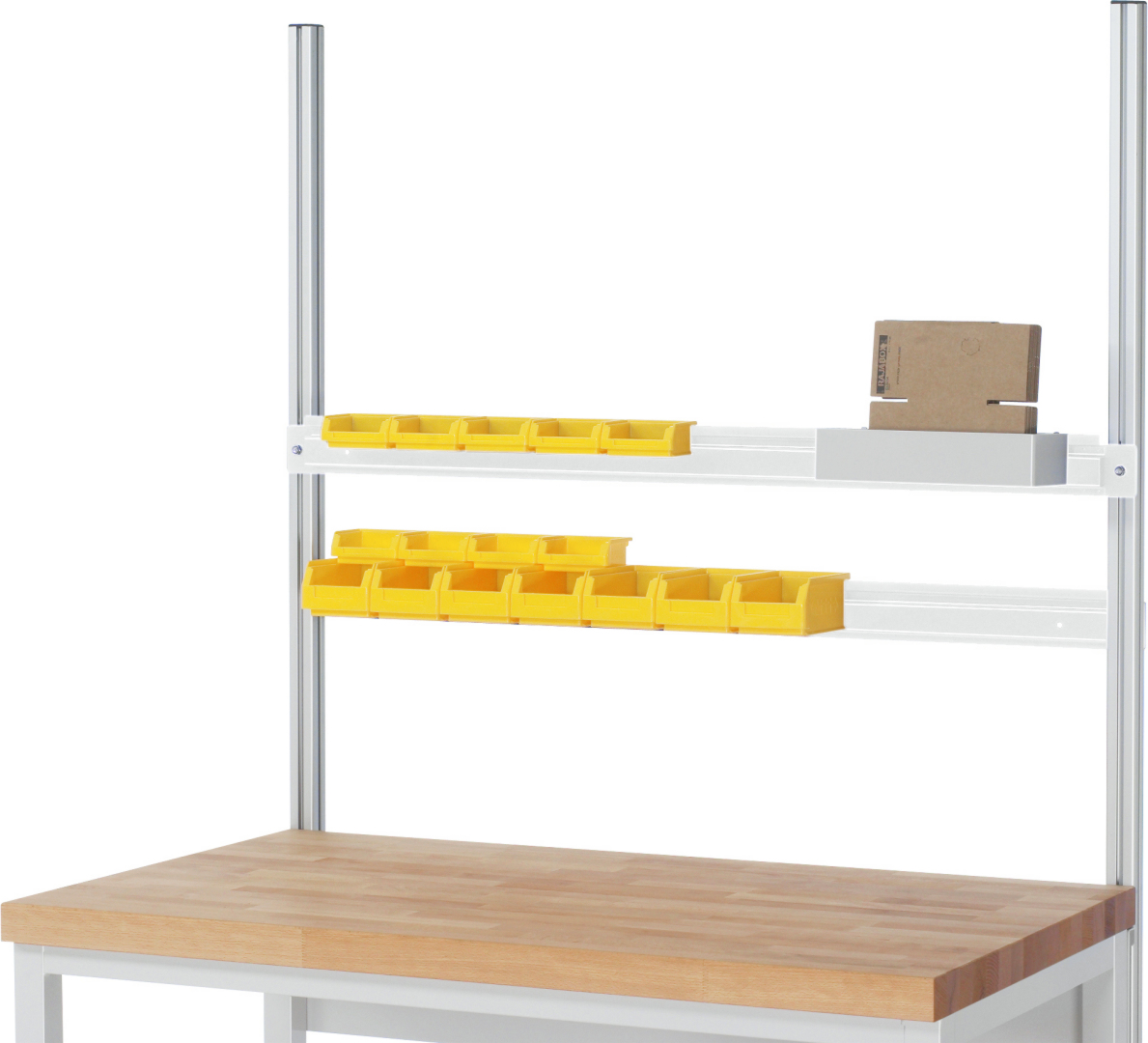 - Aufnahme von: Sichtlagerkästen (offene Einhängekante an der Rückseite der Sichtlagerkästen erforderlich), Energieleiste.