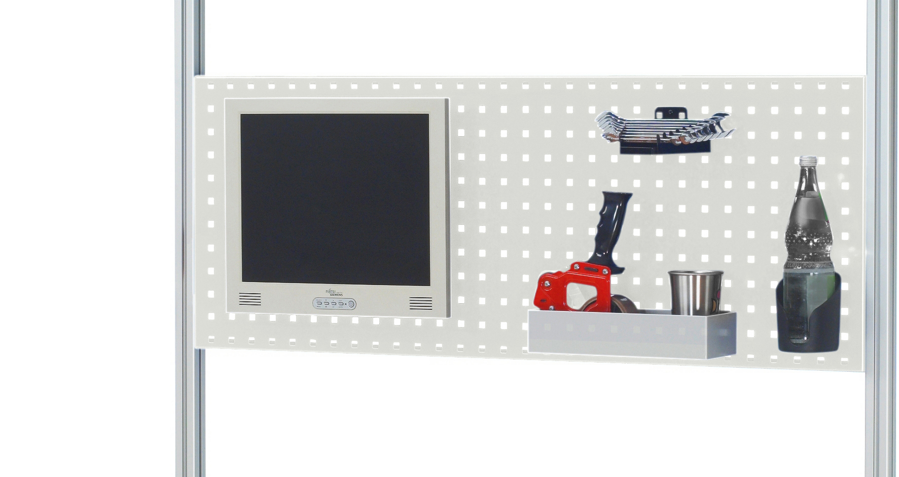 - Montage an: System-Stützen (dazwischen). Die Einbauhöhe ist stufenlos wählbar. Bei Montage einer Lochplatte können davor oder dahinter die Anbauelemente Etagenbord, Metallablage und Halteschiene montiert werden.