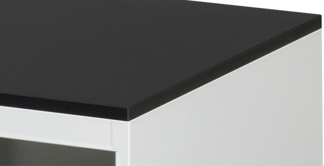 - Ober- und Unterseite mit einer schwarzen Melaminharz-Direktbeschichtung. Melaminharzbeschichtung nach DIN68765. Spritzwasserfest und schmutzresistent, Oberflächeneigenschaften nach EN14322/EN14323: Abriebfestigkeit Klasse 3A; Kratzfestigkeit N>1,5; Fleckunempfindlichkeit Stufe ≥ 3 (z.B. Aceton, Alkohol, organische Lösungsmittel, Waschbenzin); Rissanfälligkeit Stufe ≥ 3; Verhalten gegenüber Zigarettenglut Grad 3; Verhalten gegenüber Wasserdampf Grad 4. Unbedenklichkeitsbescheinigung in Bezug auf das Migrationsverhalten, dadurch auch im Lebensmittelbereich einsetzbar. Belag normal entflammbar (B2) nach DIN4102. Plattenkern aus Spanplatte nach EN309/EN312 (Emissionsklasse E1). Allseitig lichtgraue, antistatische ABS-Kante.