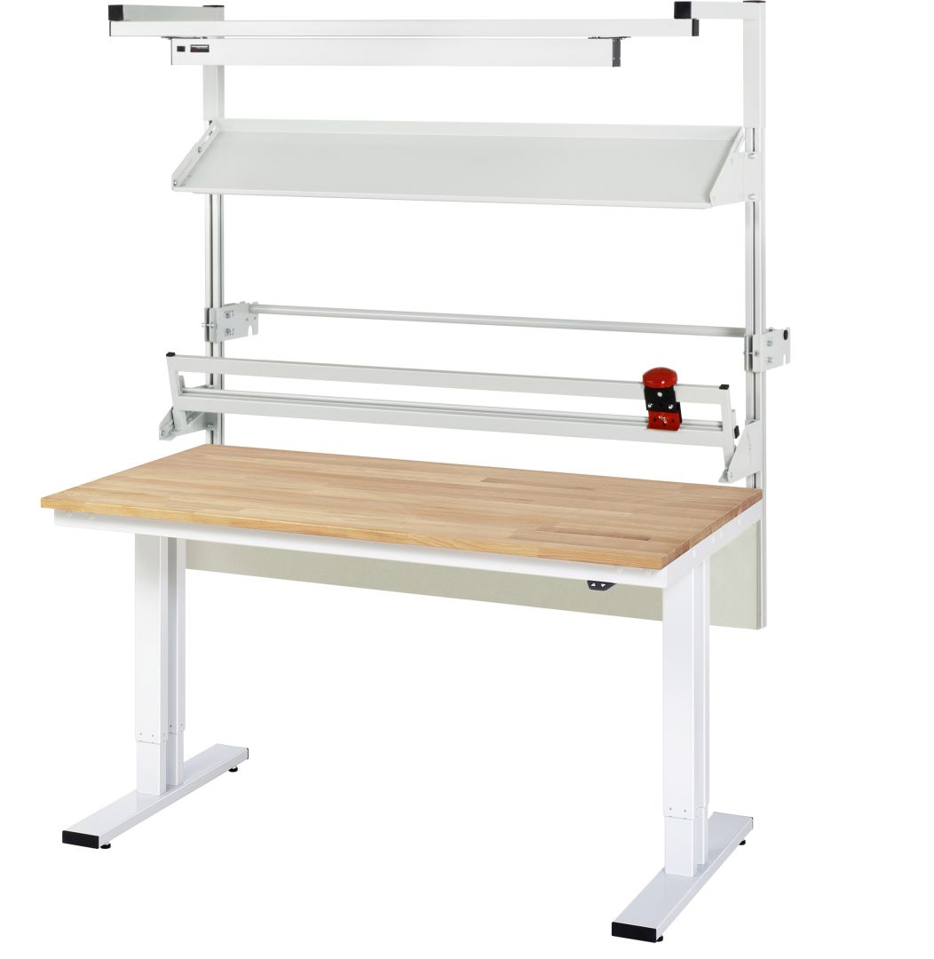 - 2 Doppelhubsäulen (80x50 mm, Prüfung gem. EN 60335-1) inkl. Steuereinheit und Anschlusskabel mit Stecker. Kufen aus Profil-Stahlrohr (100x30x3 mm) inkl. Nivellierfüßen. Kompletter Rahmen aus Profil-Stahlrohr (Stahlrohr 50x25x2,5 mm) oben unter der Arbeitsplatte. Bedienelement mit Auf-/Ab-Taster.