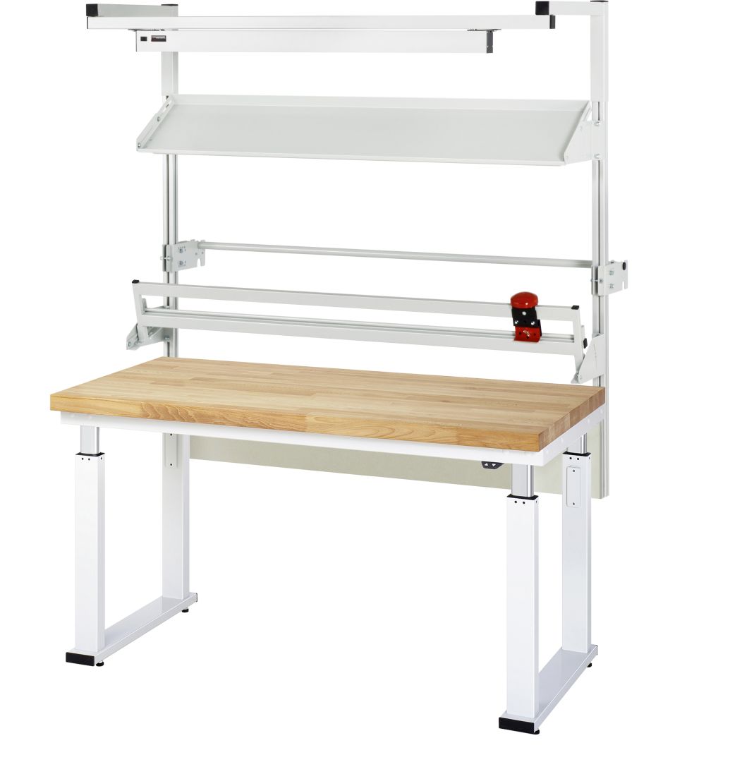 - 4 Hubsäulen (80x50 mm, Prüfung gem. EN 60335-1) inkl. Steuereinheit und Anschlusskabel mit Stecker. Kufen aus Profil-Stahlrohr (100x30x3 mm) inkl. Nivellierfüßen. Kompletter Rahmen aus Profil-Stahlrohr (Stahlrohr 50x25x2,5 mm) oben unter der Arbeitsplatte. Bedienelement mit Auf-/Ab-Taster.