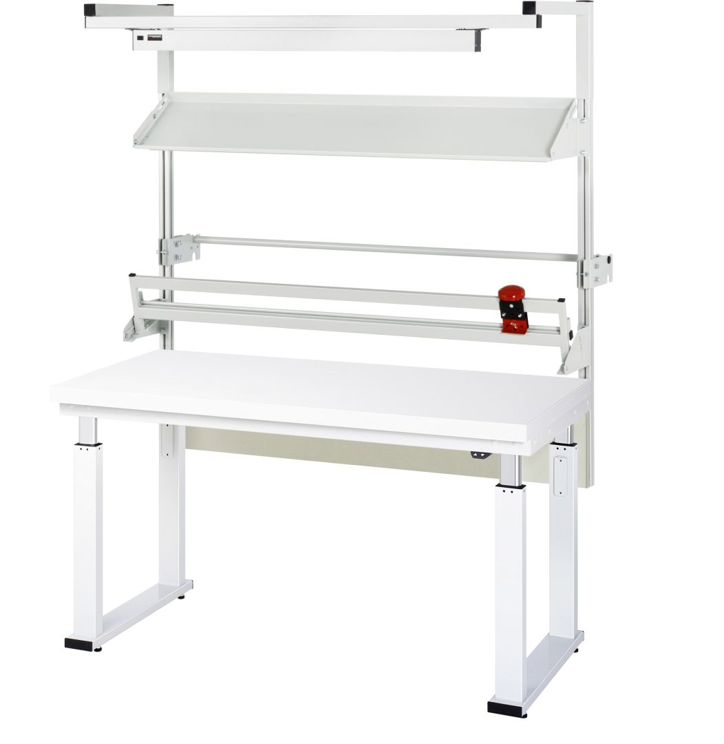 - 4 Hubsäulen (80x50 mm, Prüfung gem. EN 60335-1) inkl. Steuereinheit und Anschlusskabel mit Stecker. Kufen aus Profil-Stahlrohr (100x30x3 mm) inkl. Nivellierfüßen. Kompletter Rahmen aus Profil-Stahlrohr (Stahlrohr 50x25x2,5 mm) oben unter der Arbeitsplatte. Bedienelement mit Auf-/Ab-Taster.