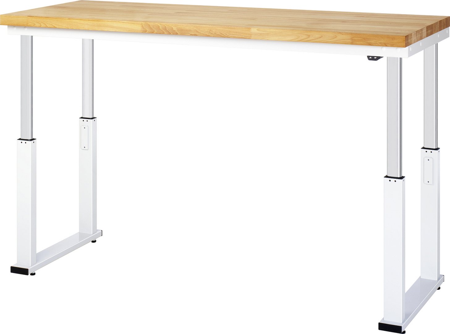 - 4 Hubsäulen (80x50 mm, Prüfung gem. EN 60335-1) inkl. Steuereinheit und Anschlusskabel mit Stecker. Kufen aus Profil-Stahlrohr (100x30x3 mm) inkl. Nivellierfüßen. Kompletter Rahmen aus Profil-Stahlrohr (Stahlrohr 50x25x2,5 mm) oben unter der Arbeitsplatte. Bedienelement mit Auf-/Ab-Taster.