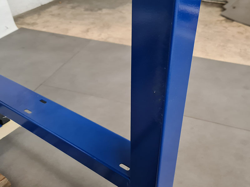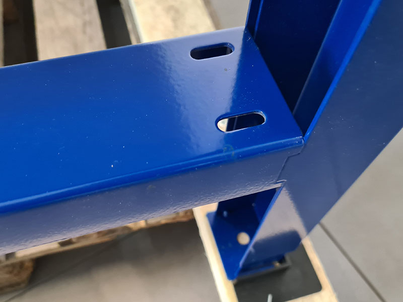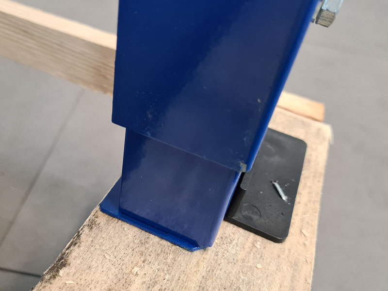- 4-Fuß Gestell mit zwei Gestellfußpaaren aus C-Profil-Stahl (70x50x2 mm) inkl. Tiefenverstrebungen (oben und unten). Gestellfüße oben mit breiter Auflagefläche (120 mm) und unten mit integrierter Höhenverstellung/Höheneinstellung mittels C-Profil-Stahl mit Lochraster (25 mm) sowie Bodenverankerungsmöglicheit durch gelochte Fußplatten.
