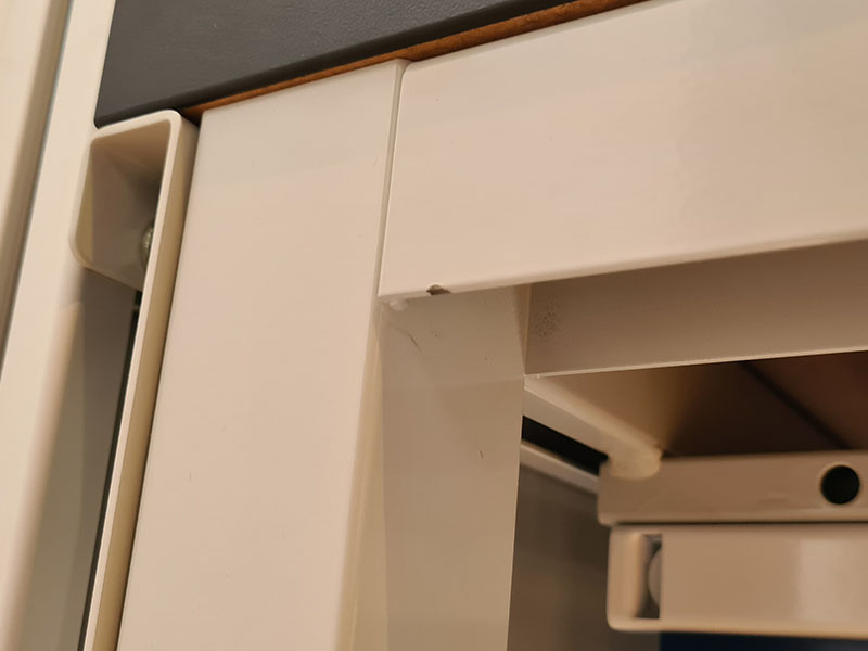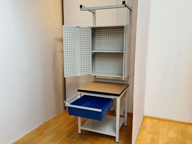 - 4-Fuß Schweißgestell mit zwei Gestellfußpaaren aus Profil-Stahlrohr (45x45x2 mm) inkl. Tiefenverstrebungen (oben und unten). Gestellfüße unten mit Abschlusselement inkl. Anti-Rutsch-Noppe für sicheren Stand. Querstreben aus C-Profil (40x40x2 mm) oben unter der Arbeitsplatte (vorne, hinten) sowie Ablageboden unten (Tiefe 650 mm hinten bündig mit Systemunterbau, Fachhöhe 620 mm). Die Gestellfüße sind vorbereitet für die Aufnahme/Nachrüstung einer Höhenverstellung und/oder eines Rollensatzes.