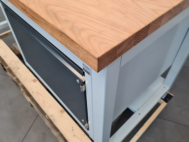 - Buche-Massiv-Arbeitsplatte mit beidseitigem Deckfurnier, Stärke 40 mm.