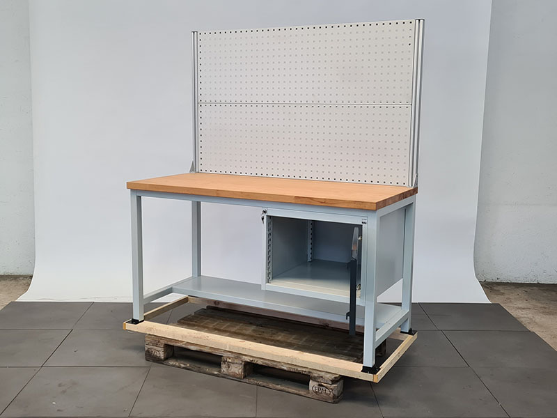 - 4-Fuß Schweißgestell mit zwei Gestellfußpaaren aus Profil-Stahlrohr (45x45x2 mm) inkl. Tiefenverstrebungen (oben und unten). Gestellfüße unten mit Abschlusselement inkl. Anti-Rutsch-Noppe für sicheren Stand. Querstreben aus C-Profil (40x40x2 mm) oben unter der Arbeitsplatte (vorne, hinten) sowie Ablageboden unten (Tiefe 320 mm, hinten bündig mit Systemunterbau, Fachhöhe 620 mm). Die Gestellfüße sind vorbereitet für die Aufnahme/Nachrüstung einer Höhenverstellung und/oder eines Rollensatzes.
