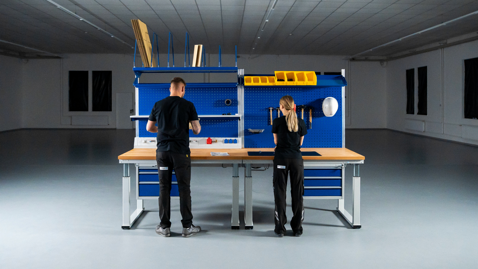 - Für mehr Flexibilität kann der Tisch mit zwei Akkuboxen betrieben werden, um eine permanente Anbindung an das Stromnetz zu vermeiden. Ab einer Größe von 2500 mm werden vier Akkuboxen benötigt. Dies wird vor allem dann empfohlen, wenn der Tisch mit Rollen ausgestattet wird.