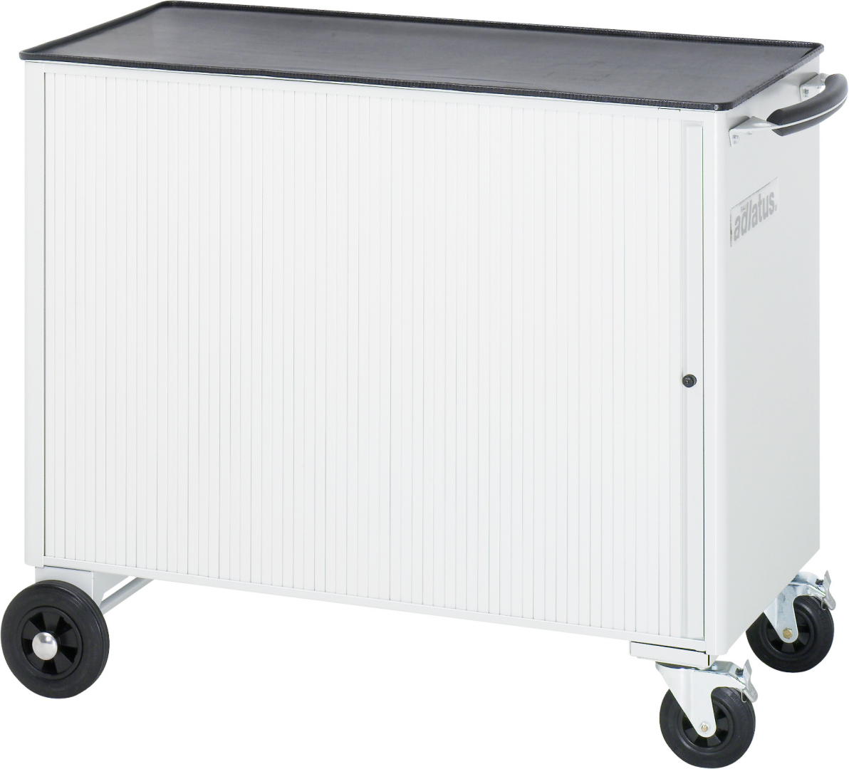 - Achse mit 2 Rädern (Überstand vorne und hinten jeweils 50 mm über den Basisschrank) an der linken Seite (Räderdurchmesser 160 mm) und 2 Lenkrollen mit Feststeller an der rechten Seite (Rollendurchmesser 100 mm, Bauhöhe 120 mm). Räder und Rollen mit Laufbelag aus thermoplastischem Gummi (grau, spurlos, 85° Shore), Radkörper aus Polypropylen.